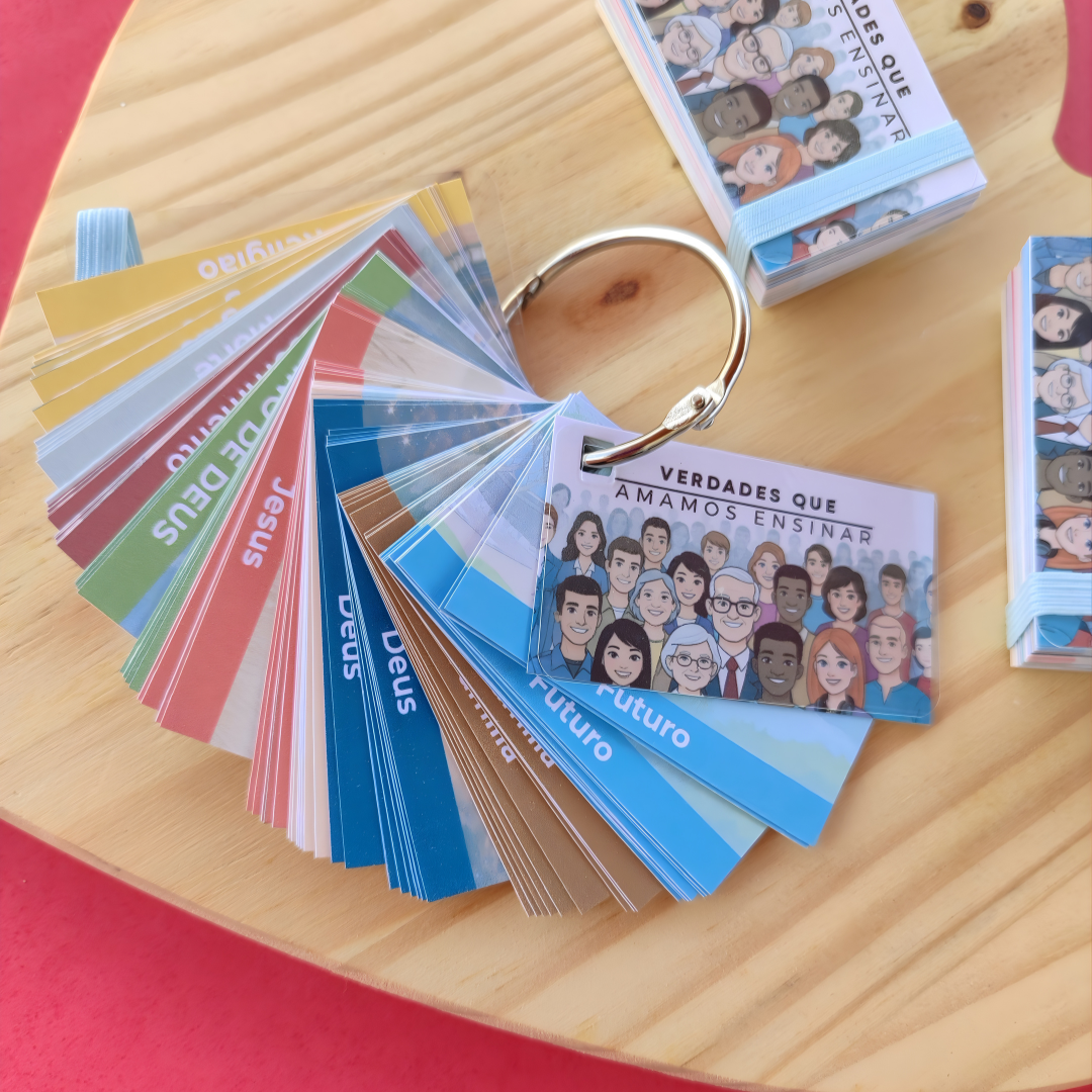 Tamanho Ideal: Cards na medida 4x7cm, perfeitos para chaveiros de mochila ou devocionais portáteis.